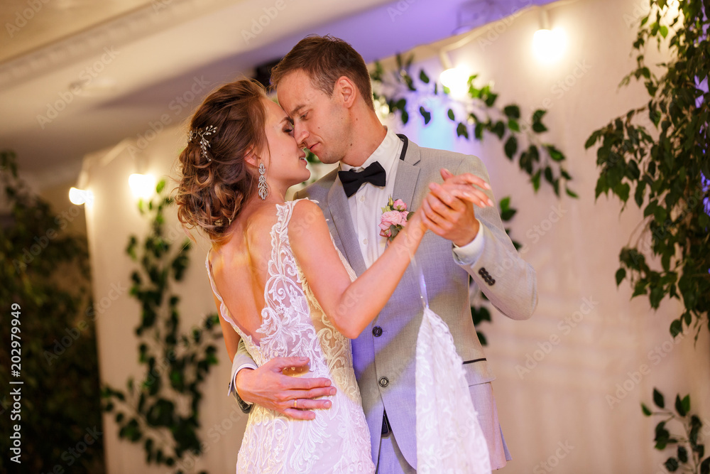 Wedding dance of bride and groom. Newlyweds couple dancing in dance hall at wedding party