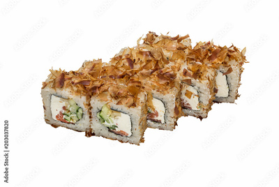 Rolls with soft cheese, tuna and shavings from tuna on top.