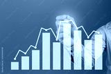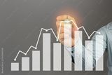 Hand of a businessman holding a pen point to top bar graph in business profits on gray background.