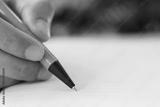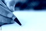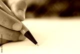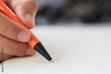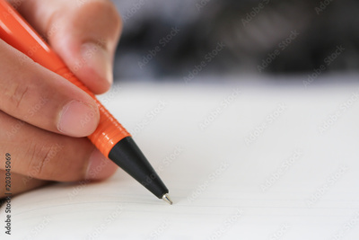 Hand of businessman hold a orange pen writing to the note on paper book.