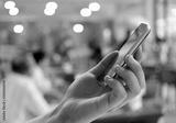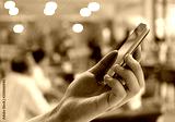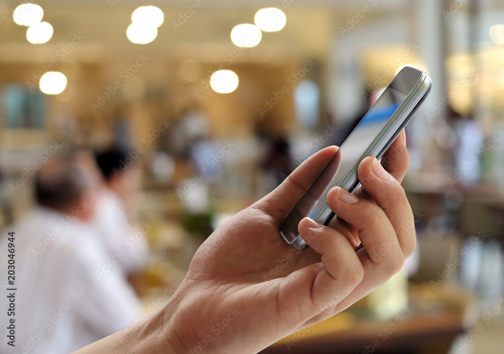 Hand of man holds a smartphone on blur restaurant background and have copy space.