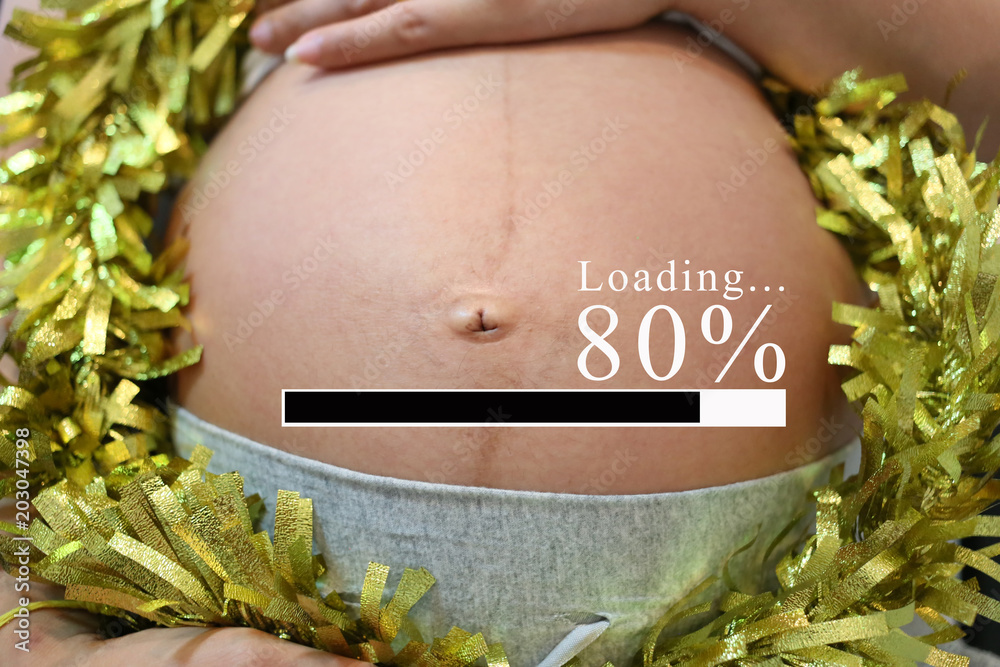 Belly of pregnant women and loading text in concept of time in childbirth.