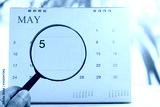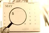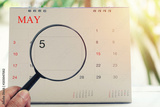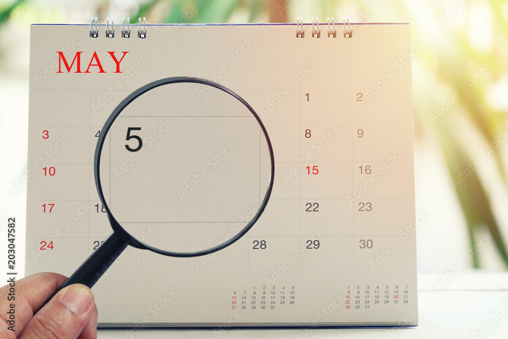 Magnifying glass in hand on calendar you can look Day Five of month,Focus number five in May.