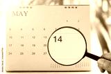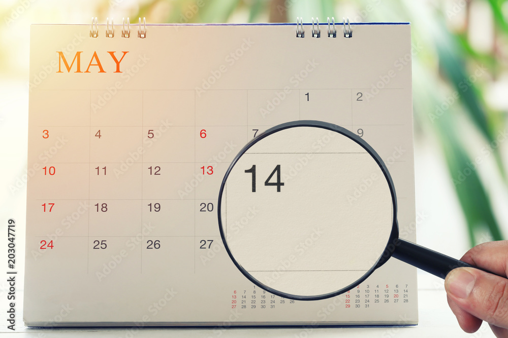 Magnifying glass in hand on calendar you can look fourteenth day of month,Focus number fourteen in May.