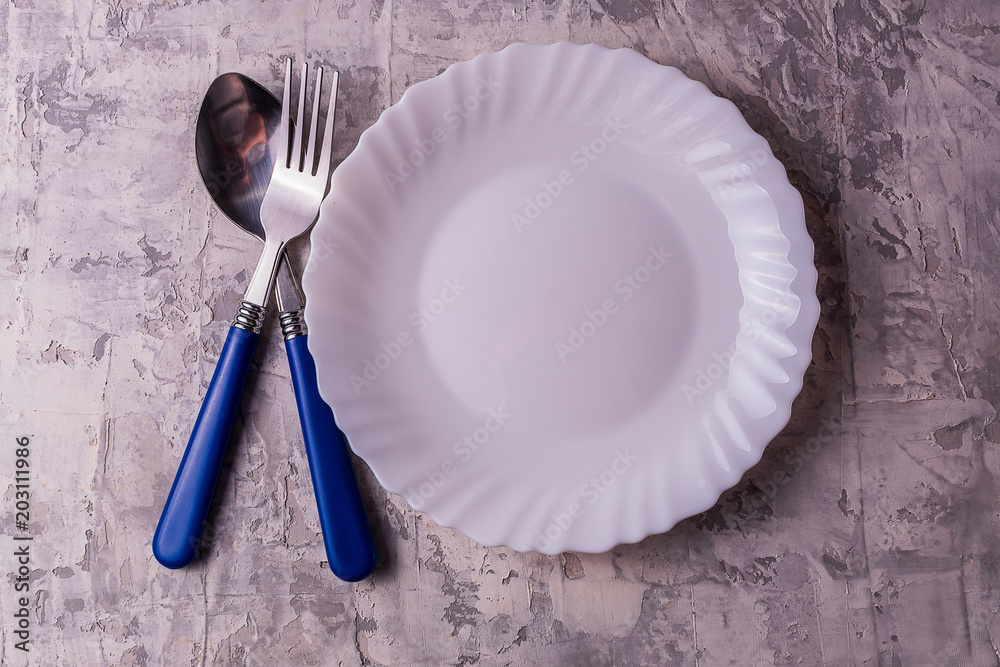 Still life with white empty plate and cutlery on white background.