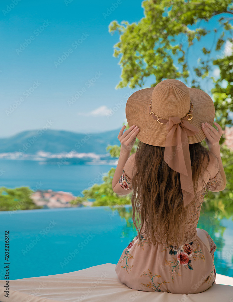 Beautiful Fashion Woman in beach hat enjoying sea view by swimming pool on luxury tropical resort. Exotic Paradise. Travel, Tourism and Vacations Concept. Elegant lady.