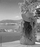 Beautiful Fashion Woman in beach hat enjoying sea view by swimming pool on luxury tropical resort. Exotic Paradise. Travel, Tourism and Vacations Concept. Elegant lady.