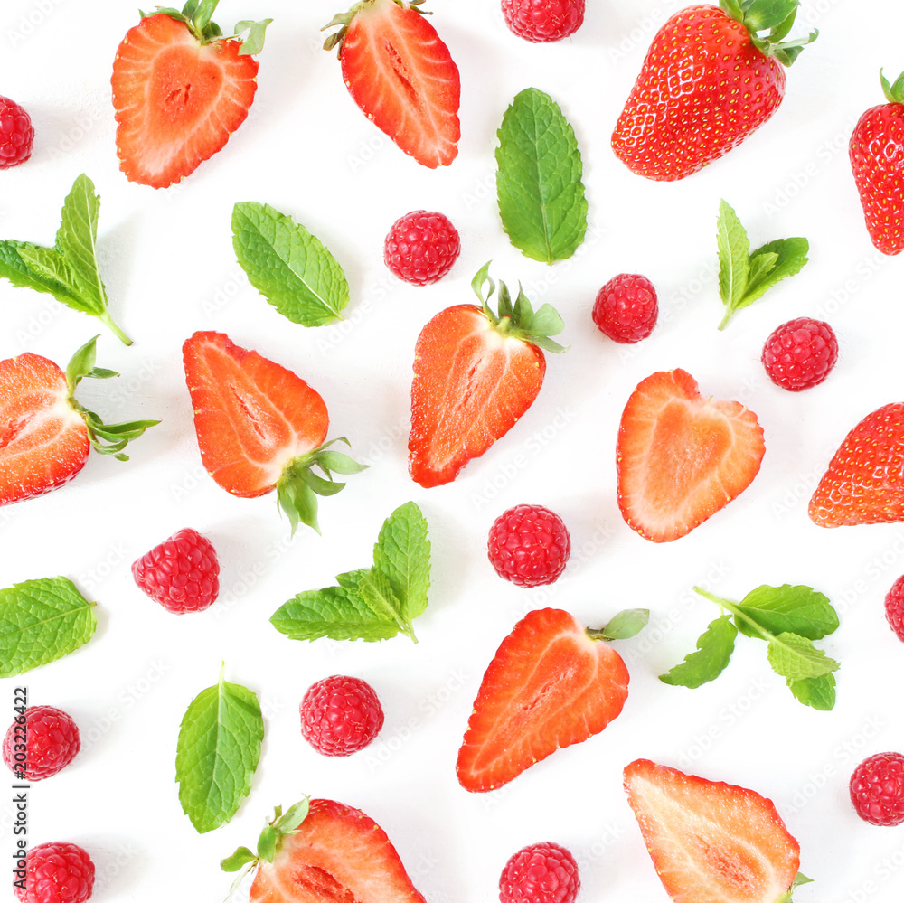 Styled stock photo. Summer healthy fruit composition with sliced strawberries, raspberries, fresh green mint leaves isolated on white wooden table background. Food pattern. Flat lay, top view, square