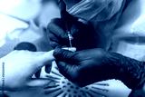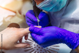 Closeup shot of hardware manicure in a beauty salon. Manicurist is applying electric nail file drill to manicure on female fingers. Selective focus.