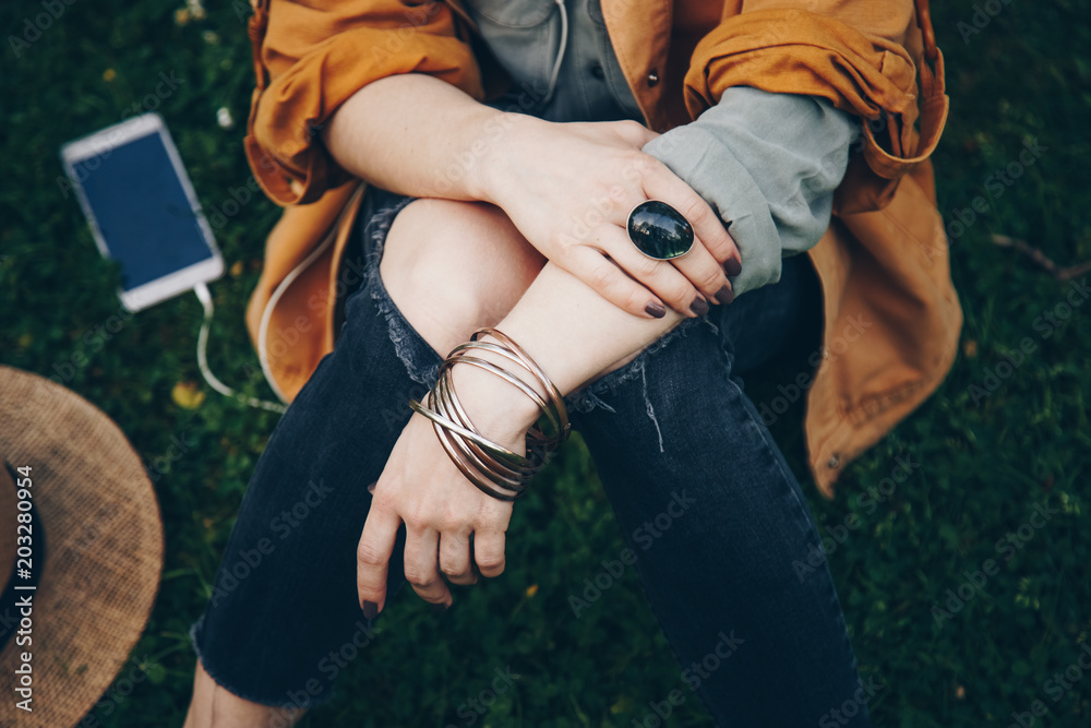 close-up of a woman wearing ring, bracelets and listening to music on her smartphone. street style detail of a boho-chic music festival female accessories. ideal summer outfit.