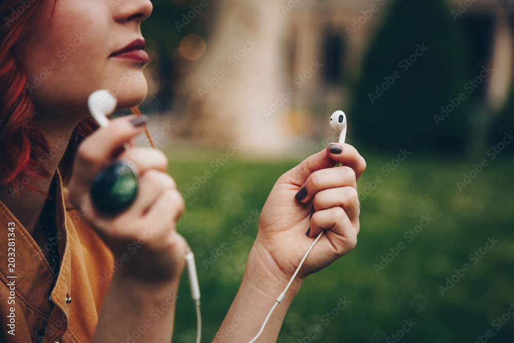 detail of a beautiful young woman holding earphones in her hands
