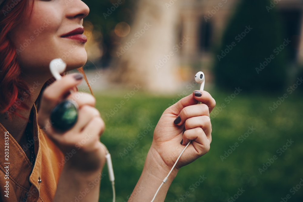 detail of a beautiful young woman holding earphones in her hands