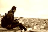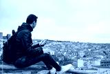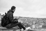A young guy looks at the landscape, travels through the mountain, a guy with a ryuzak on his back travels, relaxes in nature