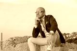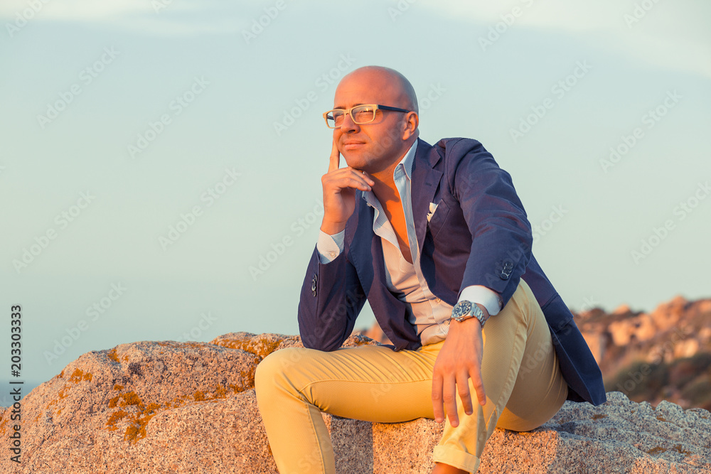 Dreaming stylish man on rock in sunset