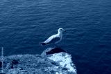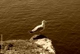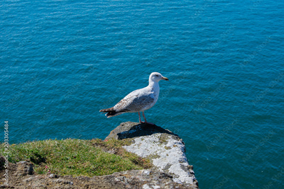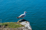 white and gray seagull bird standing on cliff above ocean water close up