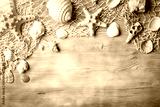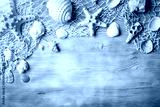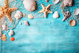 Summer time concept with seashells and starfish on blue wooden boards. Rest on the beach. Background with copy space