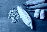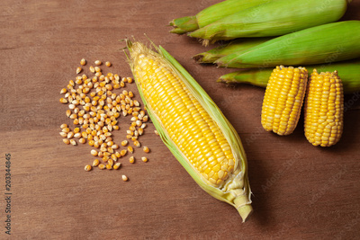 Organic fresh Corncobs or corn ears on wood background ,food