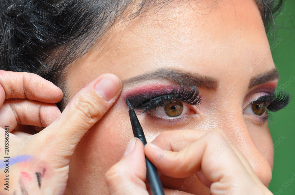 Make-up Applying closeup. Eyeliner. Cosmetic Eyeshadows. Beautiful young woman in beauty salon