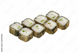 Set of japanese rolls with soft cheese and shrimps. Close-up on white background.
