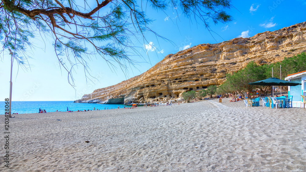 Matala beach with caves on the rocks that were used as a roman cemetery and at the decade of 70's were living hippies from all over the world, Crete, Greece