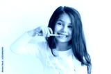 Little cute child girl brushing her teeth on white background. Space for text. Healthy teeth.