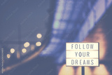 Follow Your Dreams inspirational life quote text in lightbox, city lights in background, color toned picture.