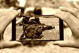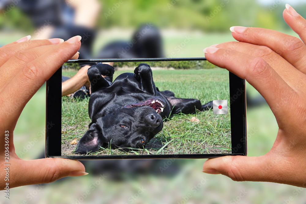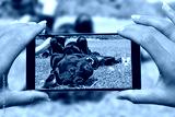 Woman with mobile phone photos dog.