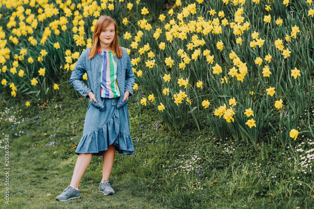 Outdoor spring portrait of young preteen kid girl wearing denim jacket and skirt, posing next to daffodil flower field