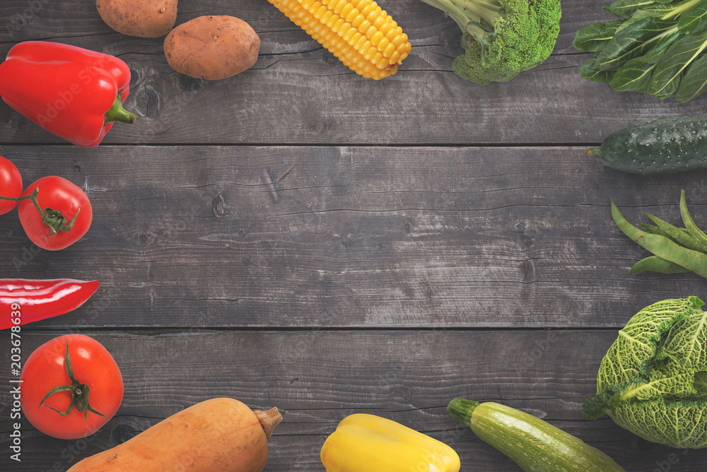 Healthy vegetables composition on traditional wooden table. Top view. Free space for text.