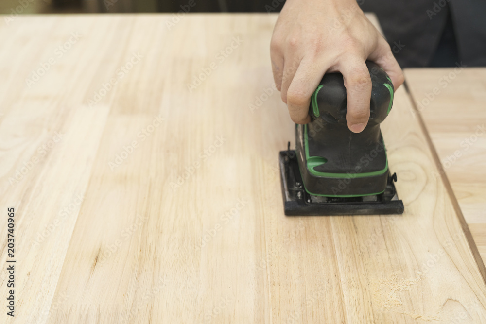 carpenter scrubbing wood board in the workshop, diy and repair concept