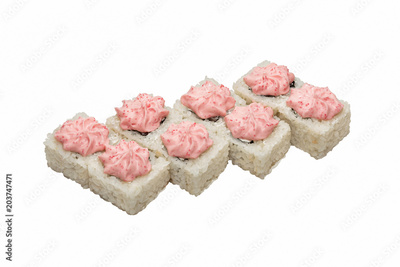 Sushi rolls with seafood and vegetables. Painted with multi-colored sauce from soft cheese.