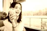 Portrait of asian woman holding a cup of Iced strawberry frappe on her hand.