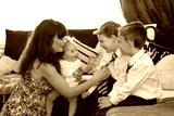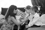 Mother getting two sons dressed for school at home whilst holding baby girl in arms