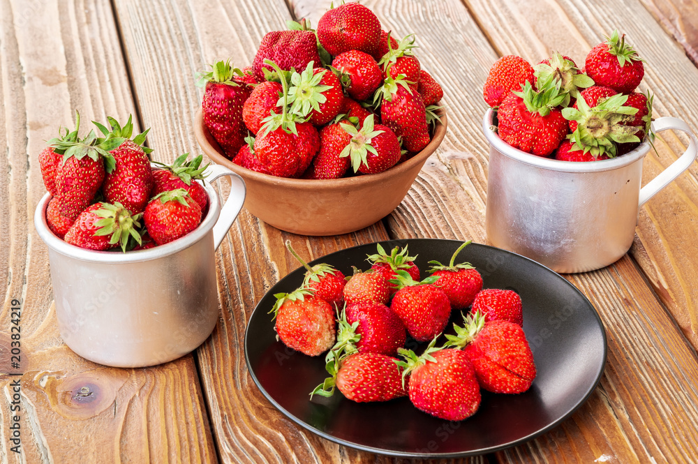 Ripe organic strawberries in a plate, in a bowl, in aluminum mugs, against brown wooden background.