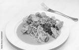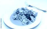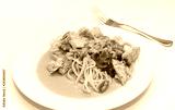 pasta with chicken fillet, mushrooms and pepper in cream sauce with turmeric on a white plate, Italian dish