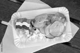 Fresh herring with onion, pickled cucumber pieces and Netherlands flag close up. Traditional Amsterdam street food.