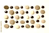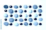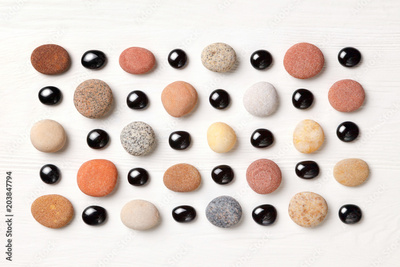 pattern of colored pebbles and black glass beads on white wooden background. Flat lay, top view