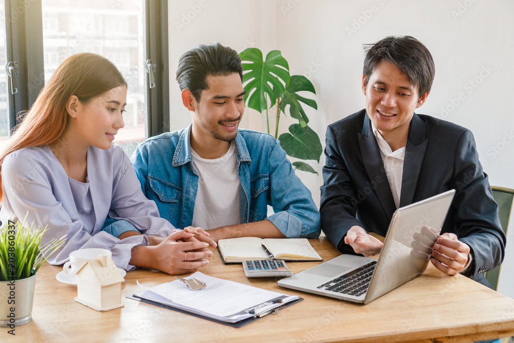 Sale representative offer the house price list and condition for house purchase or rental via technology computer on the working space table in new house,Moving and House Hunting concept