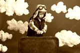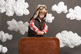 boy dressed as an airplane pilot stand between the clouds with old suitcase and playing with handmade plane