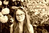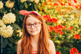 Close up portrait of adorable red-haired kid girl wearing eyeglasses, bright summer image