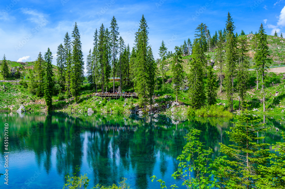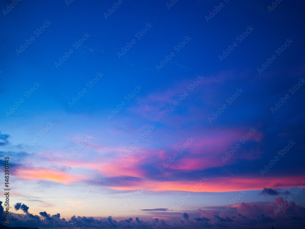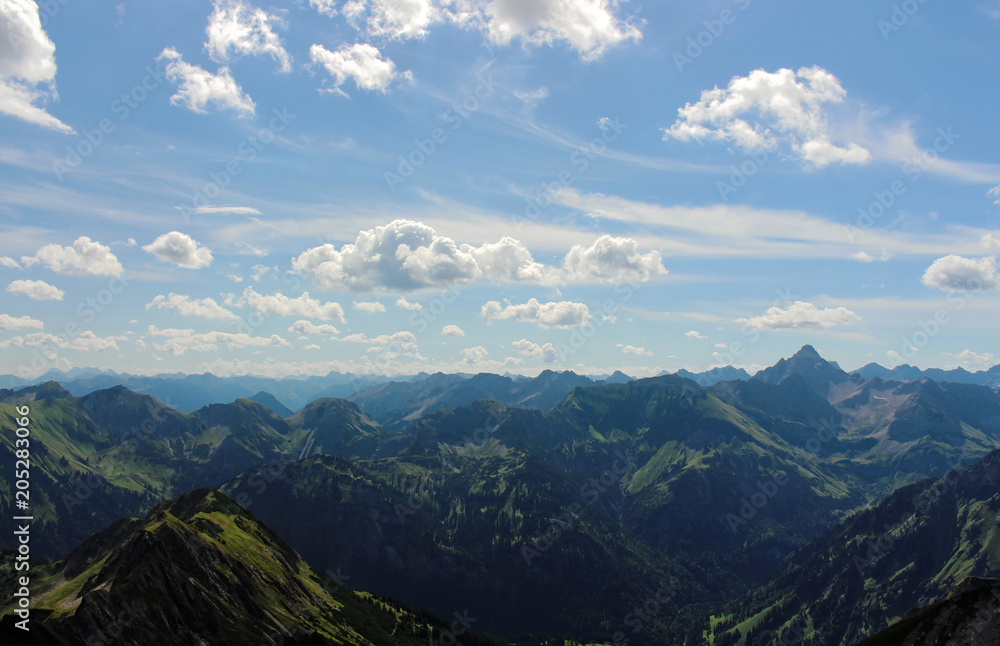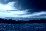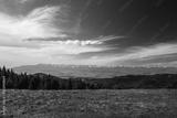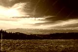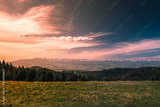 A very beautiful landscape with a valley and a forest, in the distance is seen a high mountain chain covered with snow at sunset, red sky