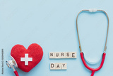 International Nurses Day, May 12. Healthcare and medical concept. Handmade Red heart with Stethoscope and Nurse day wooden block on blue background.
