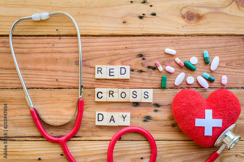 Wooden Block for World Red Cross and Red Crescent day, May 8. Healthcare and medical concept. Red heart with Stethoscope on wooden table background texture.