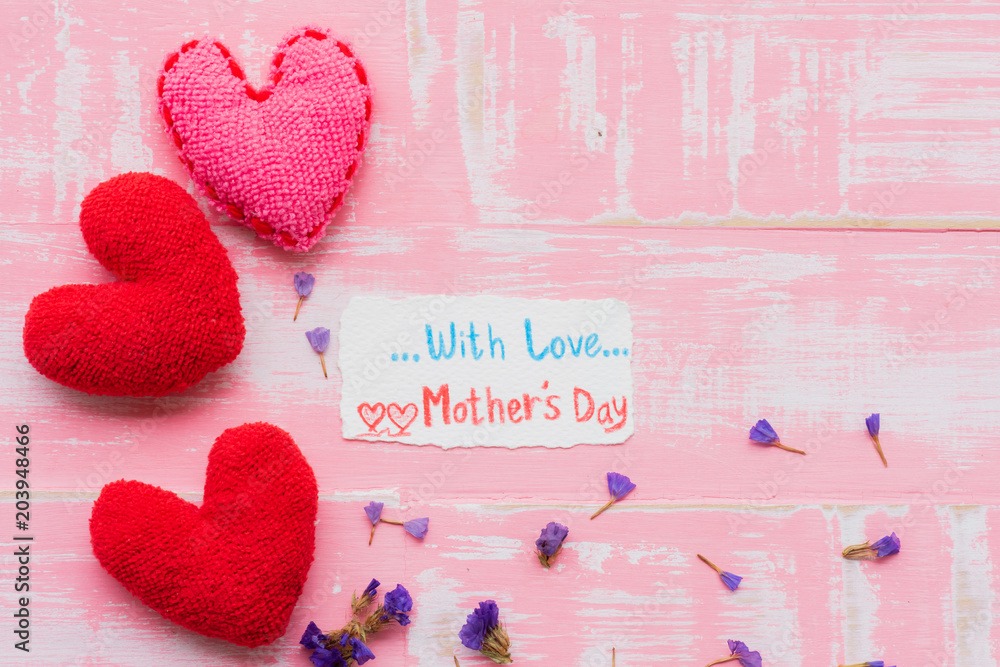 Happy mother's day concept. Top view of Love you MOM text on paper tag with pink handmade heart on bright pink pastel wooden background.