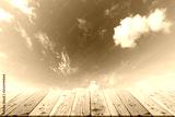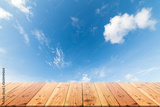 Wooden table on blue sky and white cloud background for spring or summer concept.