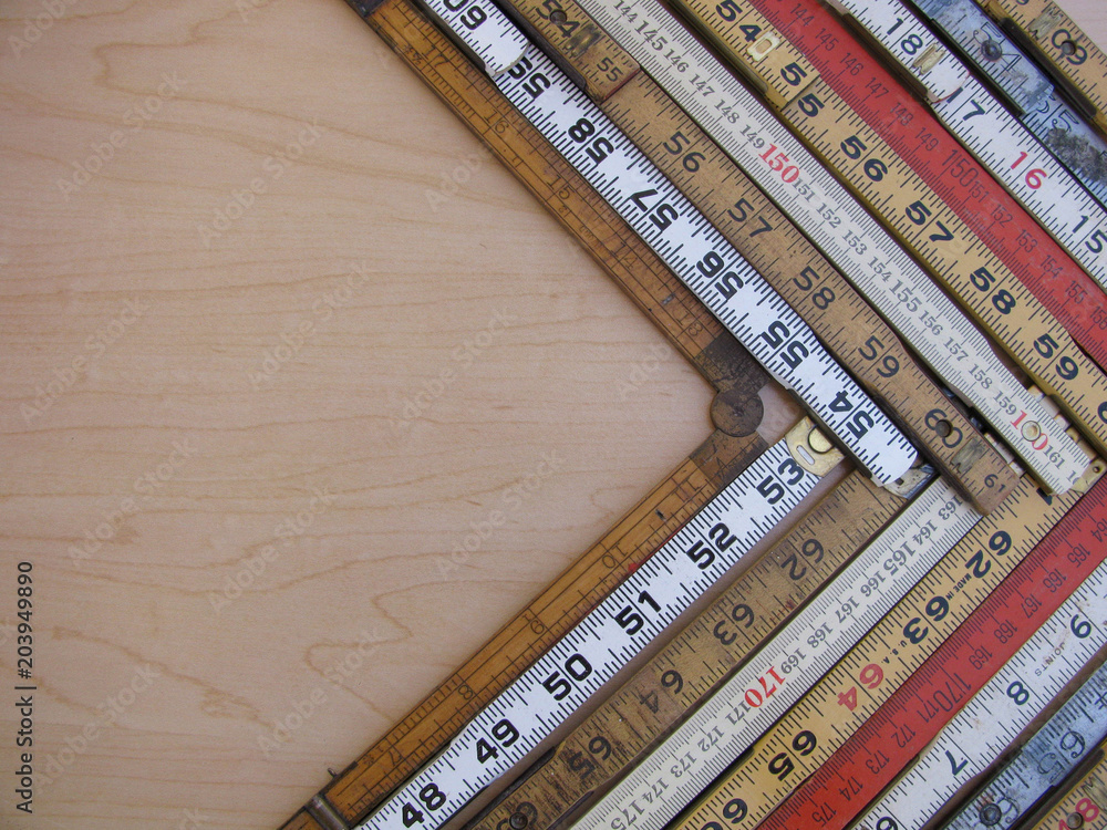 A chevron of rulers and scales in metric and inches is a business graph or chart representing accuracy, measurement, increase, growth and results with copy space.