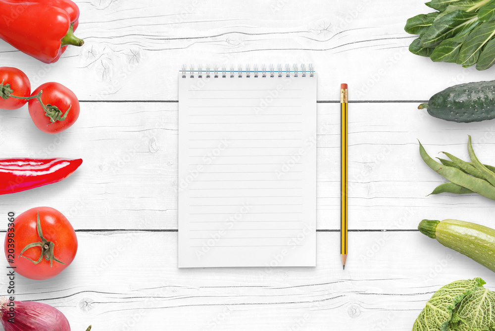 Empty pad for a list of ingredients on white wooden table. Red and green vegetables beside.