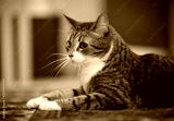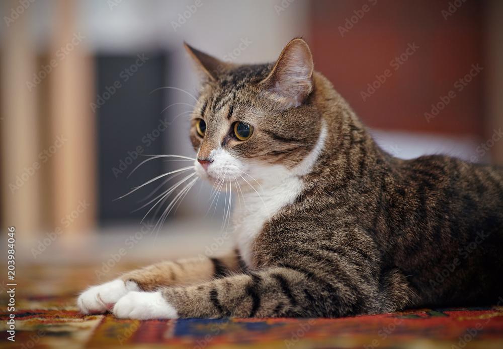 Portrait of the striped cat lying on a carpet.