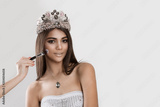 Brunette woman with crown, is at the salon stylist about to make her makeup