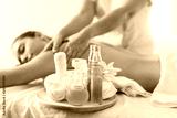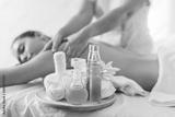 Bottle of essential oil on a wooden tray. background Young beautiful Asian woman relaxing in the spa massage